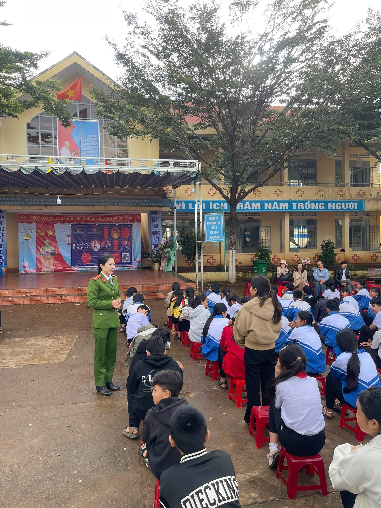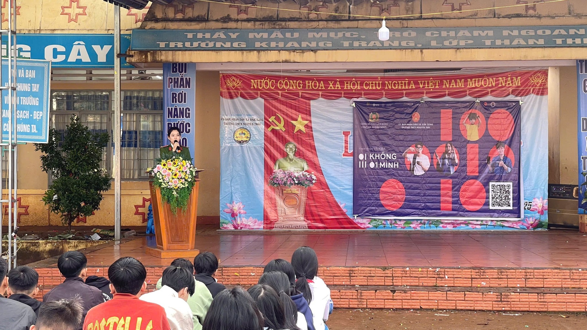 Đặc biệt, nhà trường vinh dự đón các đồng chí Công an xã Đắk Song đến tuyên truyền chiến dịch “KHÔNG MỘT MÌNH” – Bảo vệ trẻ em trên không gian mạng 🌐👶🛡️.