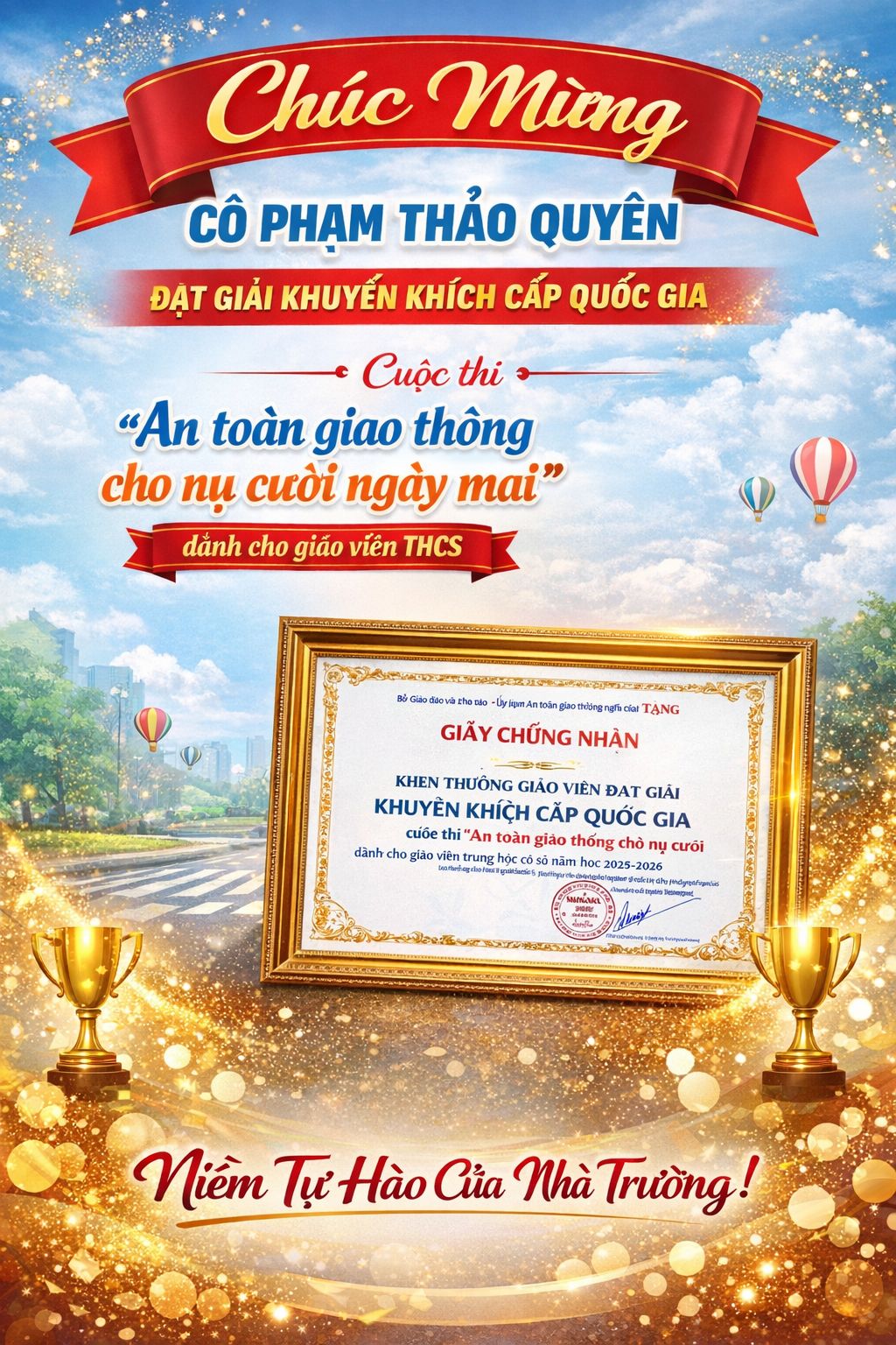 Xin chúc mừng cô Phạm Thảo Quyên đã đạt giải Khuyến khích cấp Quốc gia trong Cuộc thi “An toàn giao thông cho nụ cười ngày mai” dành cho giáo viên THCS.